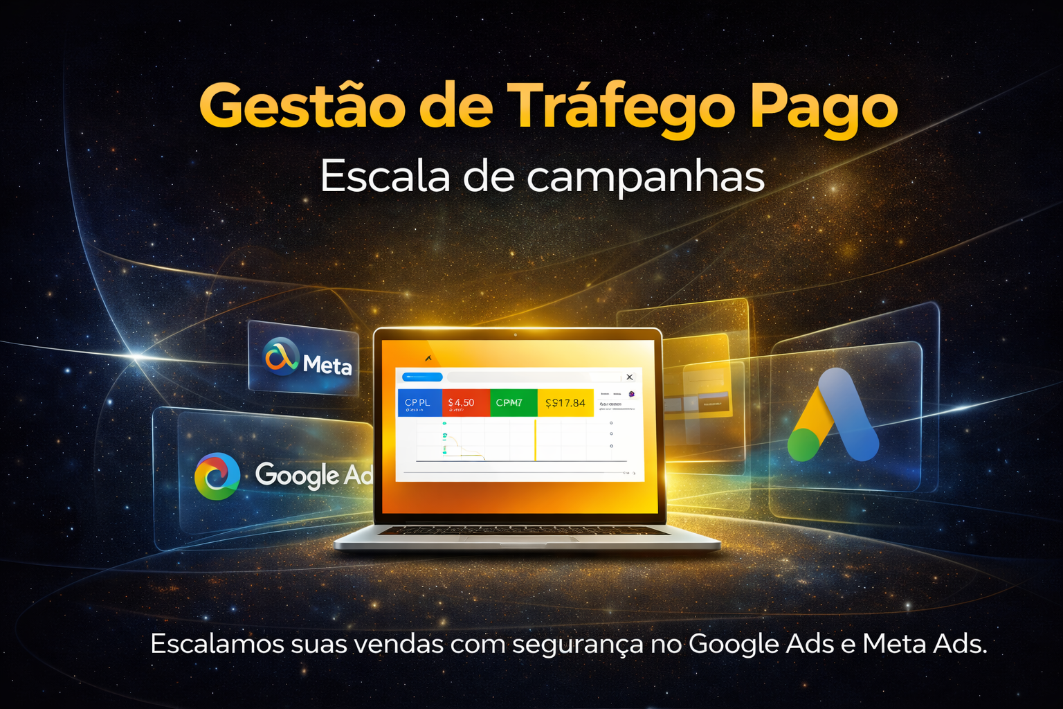 Gerenciamos campanhas no Google Ads e Meta Ads para escalar suas vendas com segurança e ROI positivo.