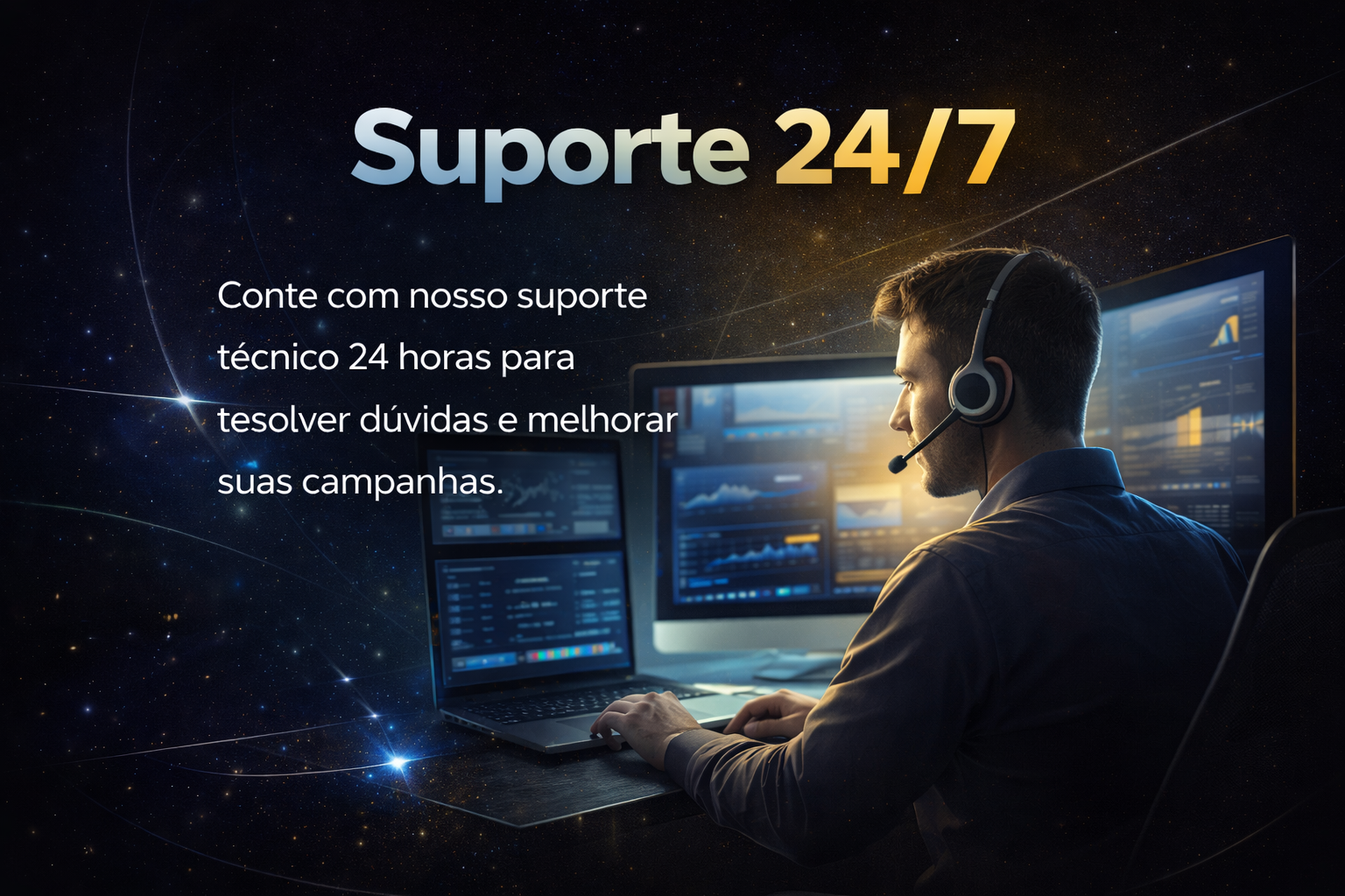 Nosso time oferece suporte técnico e estratégico para manter suas campanhas rodando e escalando.