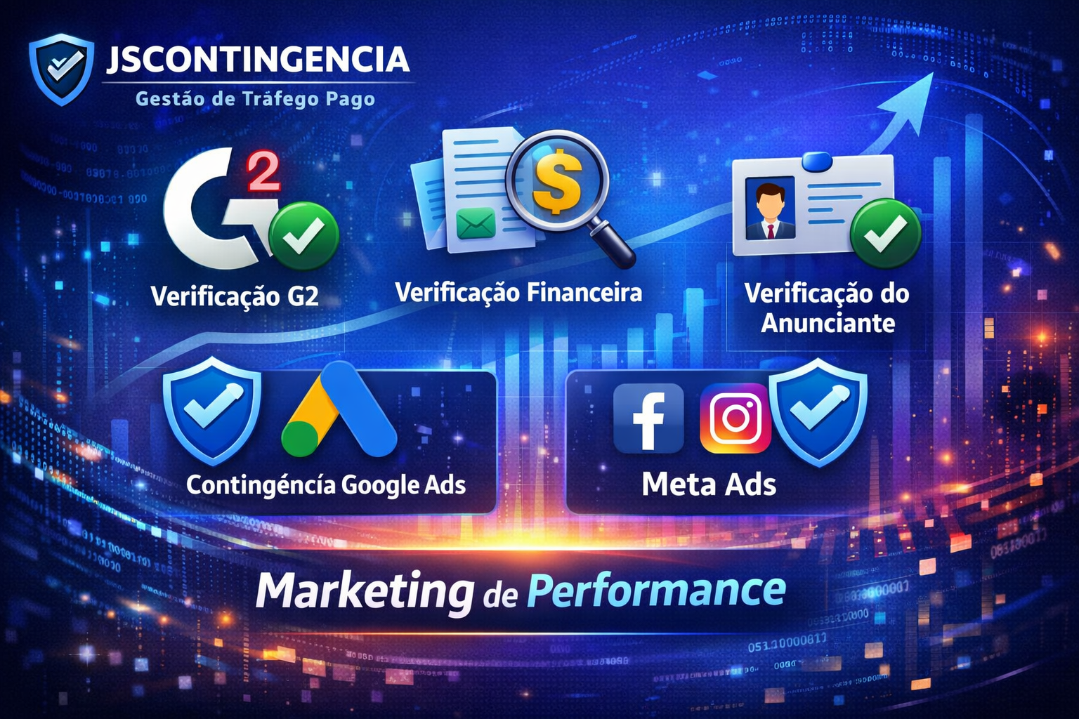 Jscontingencia | Gestão de Trafego Pago Verificação G2, Verificação de Operações Financeiras, Verificação do Anunciante, Contingência Google Ads, Meta Ads, Marketing de Performance